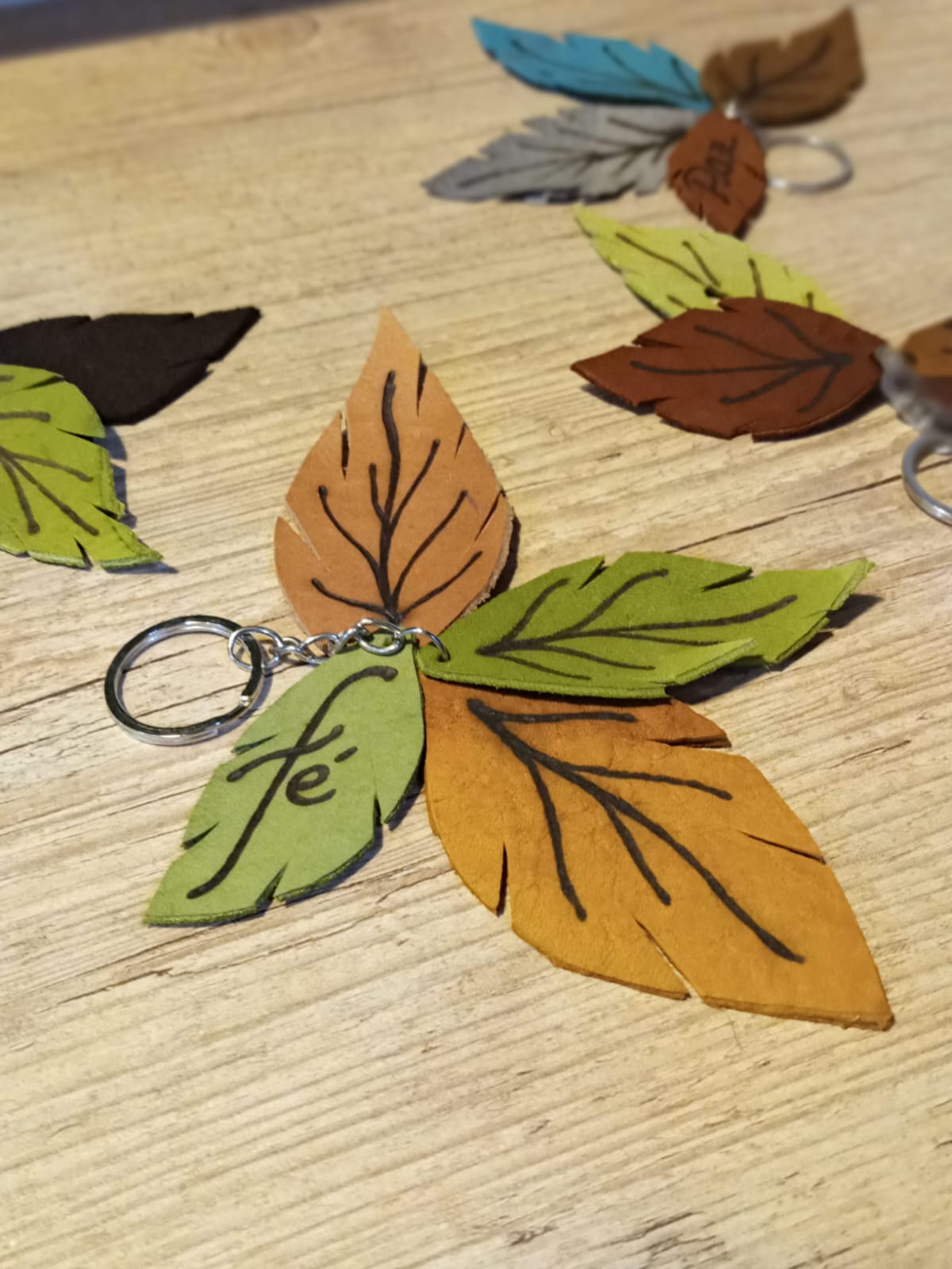 DESCRIÇÃO: Os Chaveiros MENSAGEIROS, são Compostos com 4 Folhas de Couro Legítimo; recortadas manualmente, com variação de Tamanhos, Formatos, Cores e Espessuras.