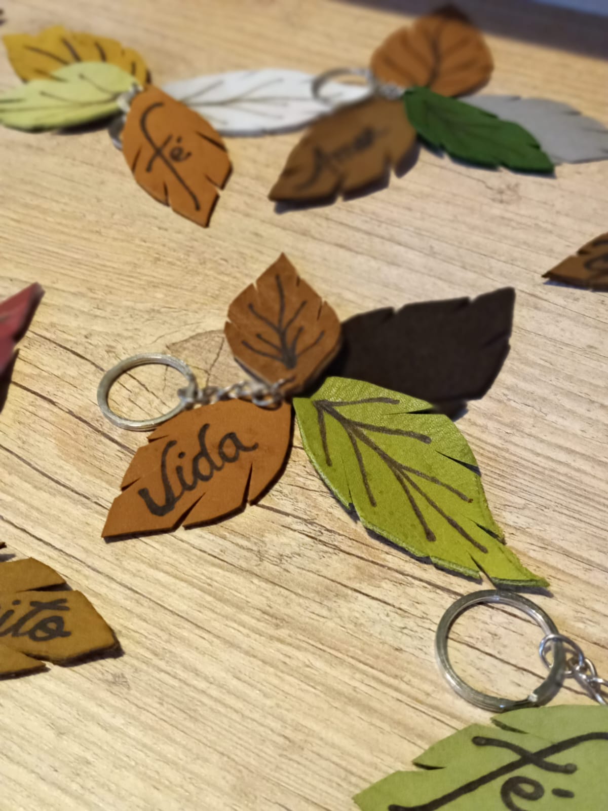 DESCRIÇÃO: Os Chaveiros MENSAGEIROS, são Compostos com 4 Folhas de Couro Legítimo; recortadas manualmente, com variação de Tamanhos, Formatos, Cores e Espessuras.